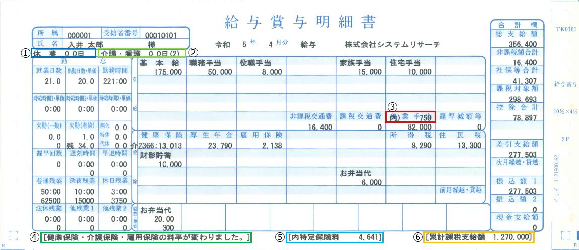 以下の画像で、印刷メッセージや特定保険料・累計課税支給額の印字位置も確認ができます。