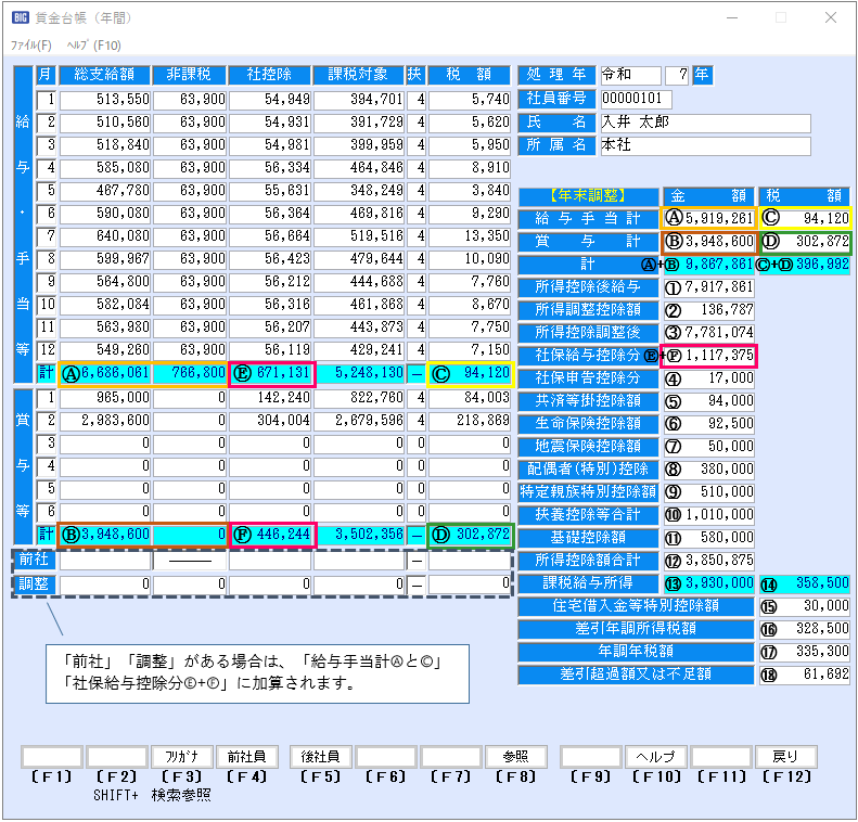 最後給与・・・12月の月例更新を行っていない場合、12月欄は0円の表示ですが、「給与手当計」のⒶとⒸ・「社保給与控除分」のⒺ+Ⓕには給与金額が加算されています。