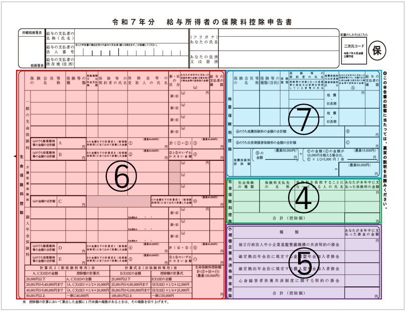 ④社保申告控除分、⑤共済等掛控除額、⑥生命保険控除額、⑦地震保険控除額