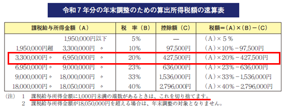 (給与手当計Ⓐ+賞与計Ⓑ)の金額を、『年末調整のしかた(国税庁発行)』の47ページ~「令和7年分の年末調整等のための給与所得控除後の給与等の金額の表」に当てはめます。