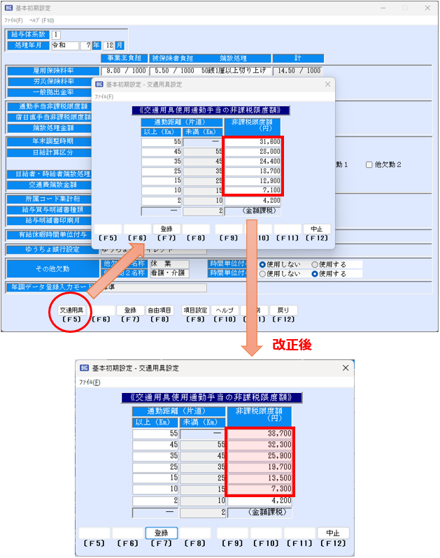 ③ 今回改正となった非課税限度額の金額を修正し、「登録(F7)」をクリックします。