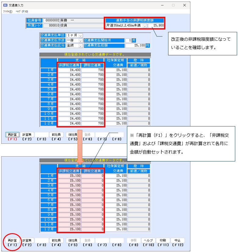 ⑥「通勤手当の非課税限度額」が改正後の金額になっていることを確認して、「再計算(F1)」をクリックします。