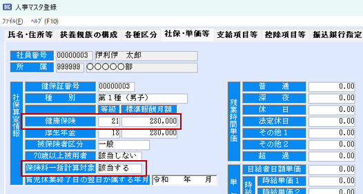 ① [マスタ管理] → [人事マスタ] から該当社員を呼び出し、「社保・単価等」タブで健康保険の「等級」「標準報酬月額」が正しいか確認します。