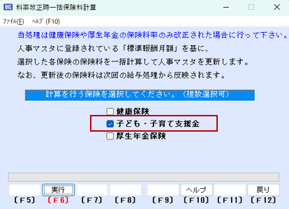 [マスタ管理] → [料率改正時一括保険料計算]を開き、「子ども・子育て支援金」にチェックを付けて「実行」をクリックします。