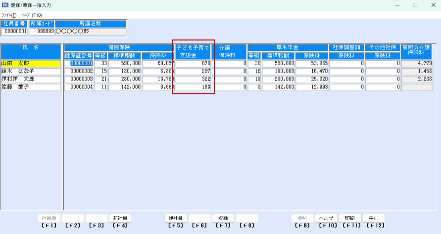 ② 子ども・子育て支援金を一括で計算し、人事マスタの「子育て支援金」にセットします。