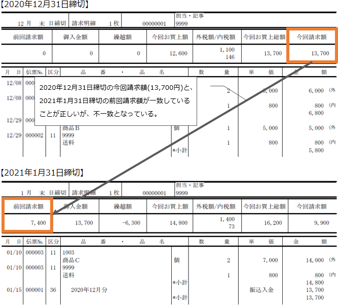 ここでは、2020年12月31日締切の今回請求額と、2021年1月31日締切の前回請求額の金額が不一致の場合を例として説明します。
