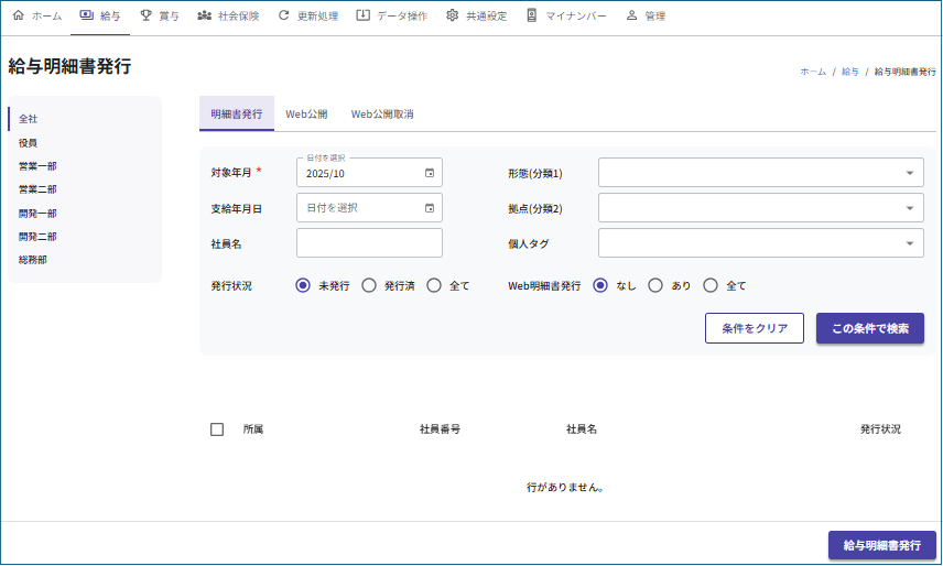 ③「給与明細書発行」メニューを開き、再度検索・発行を行ってください。