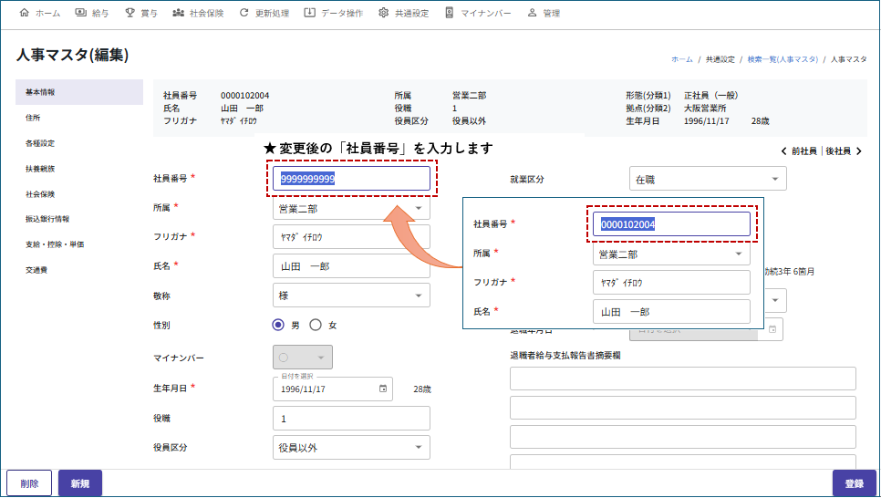 再雇用や退職などに伴い、社員番号を変更する必要がある場合は、以下の手順で設定を変更してください。