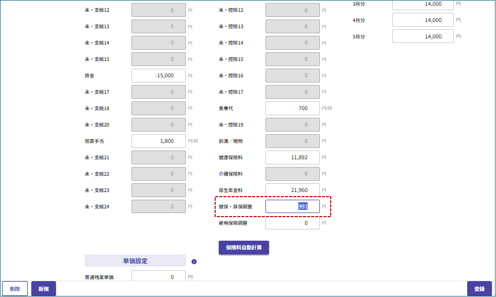 2.あらかじめ設定しておいた「健保・厚保調整」の項目に、徴収する金額をそのまま入力します。