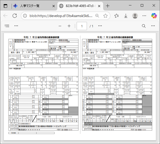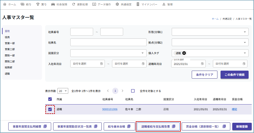 退職した従業員の源泉徴収票を印刷する場合は、以下の手順で行ってください。