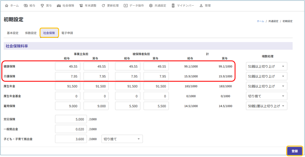 ② 【社会保険料率】の「健康保険」「介護保険」を新しい保険料率に変更し、[登録]をクリックします。