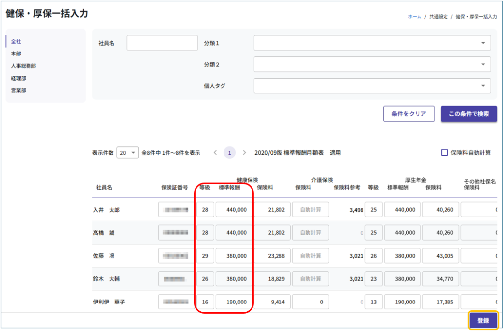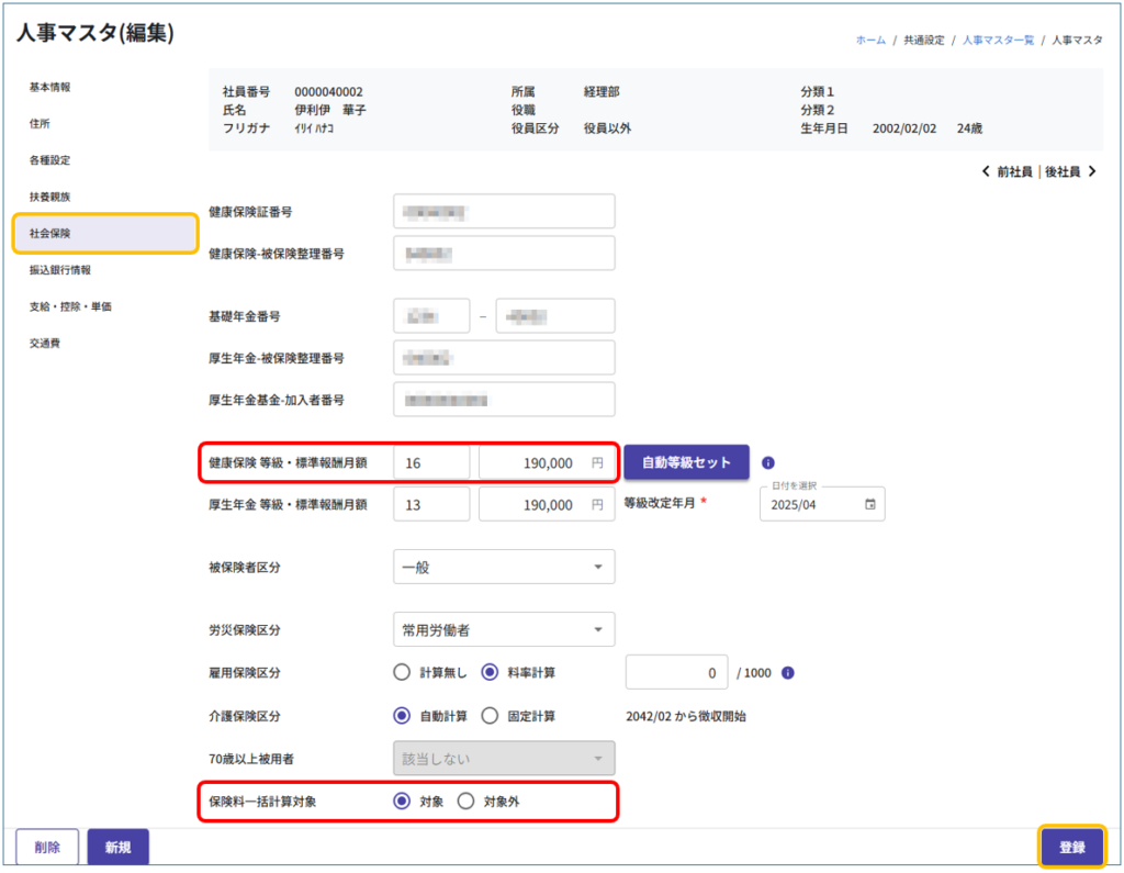 ③ 共通設定メニューの[人事マスタ一覧]から該当従業員の人事マスタを開き、「社会保険」タブで健康保険の「等級」「標準報酬月額」が正しいか確認します。