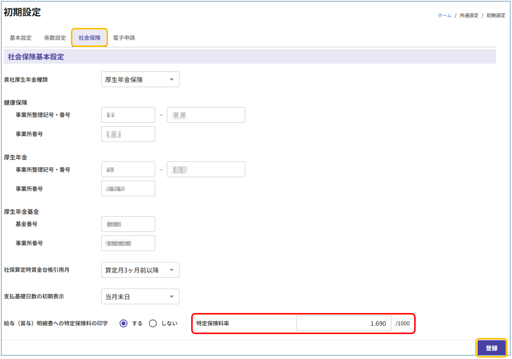 ※「特定保険料」を給与明細書に印字している場合は、【社会保険基本設定】の「特定保険料率」に変更後の折半した特定保険料率を入力してください。