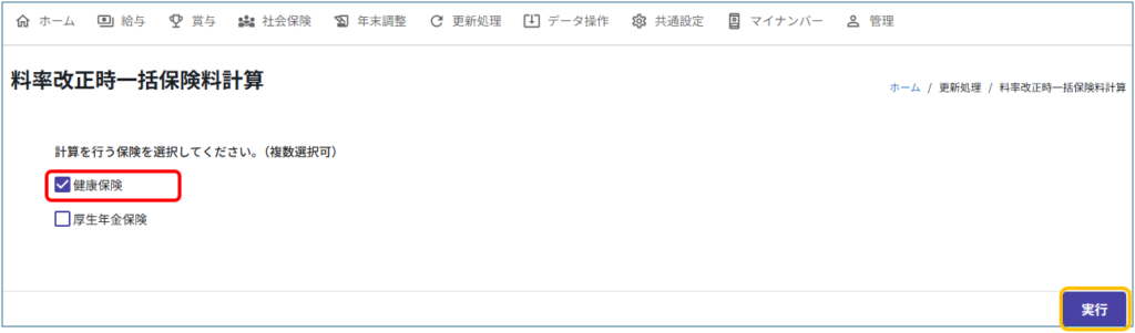 更新処理メニューの[料率改正時一括保険料計算]を開き、「健康保険」にチェックを付けて「実行」をクリックします。
