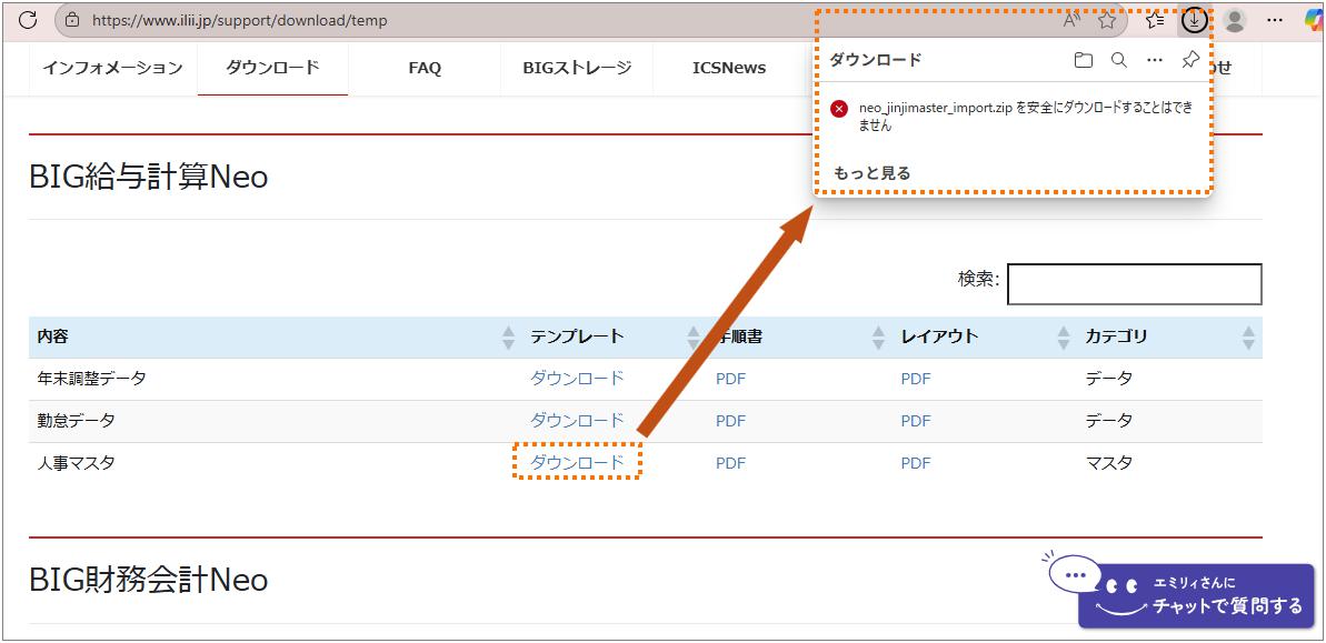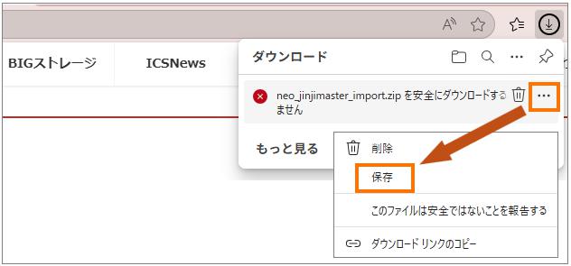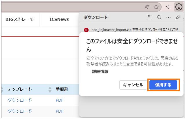 ICS会員様専用サイトのダウンロードから「ファイル取込テンプレート」を選択し、テンプレートファイルをダウンロードしようとすると「安全にダウンロードすることはできません」と表示される。