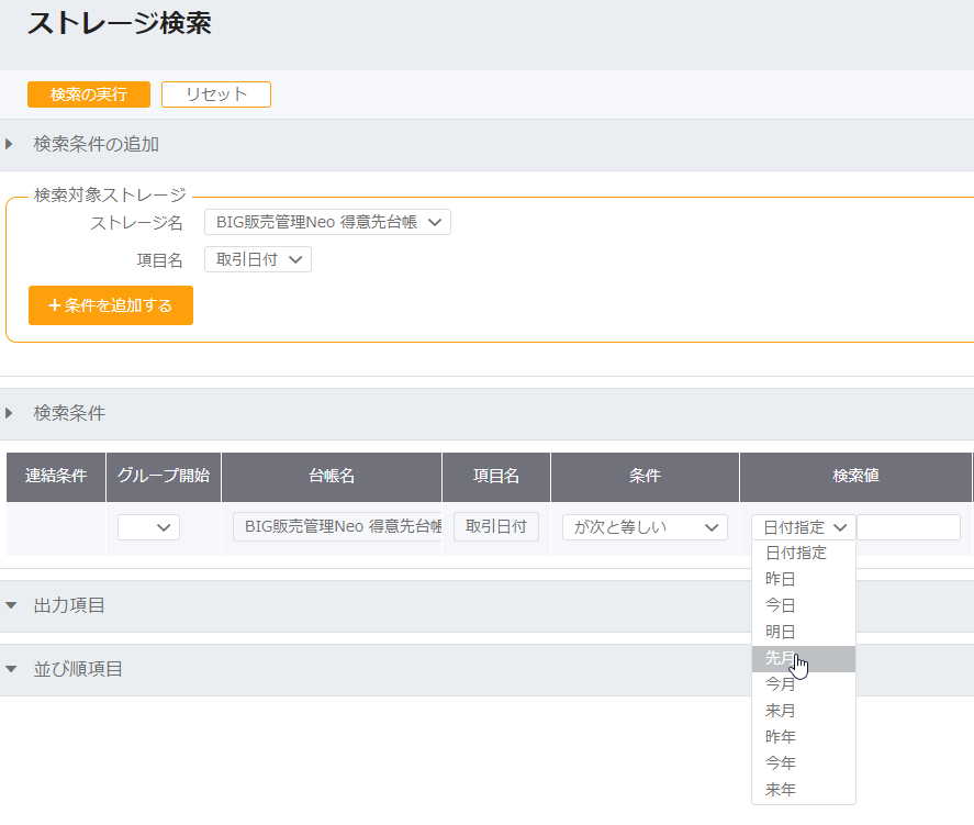 取引年月日の検索では、日付指定のほかに「昨日」「今日」「明日」「今月」「来月」「昨年」「今年」「来年」といった条件指定が可能です。