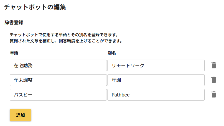 単語を辞書として登録することで、チャットで別名で質問がされた場合にも、正しい回答が表示される
